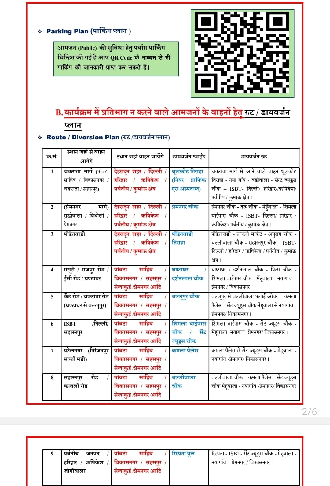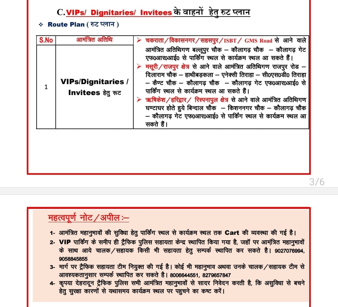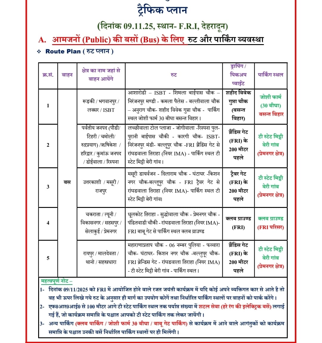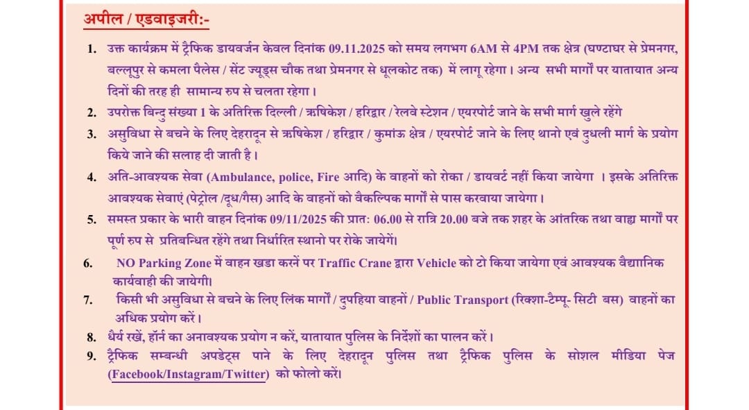 यातायात योजना 09 नवंबर की सुबह 6 बजे से रात 8 बजे तक लागू रहेगी। इस अवधि में भारी वाहनों का शहर के आंतरिक व बाहरी मार्गों पर प्रवेश वर्जित रहेगा। हालांकि, रूट डायवर्जन प्लान शाम 4 बजे तक प्रभावी रहेगा। इसका सर्वाधिक असर चकराता रोड के माध्यम से एफआरआई जाने वाले मार्गों पर पड़ेगा। ऐसे यात्रियों को वैकल्पिक मार्गों से यात्रा करनी होगी।